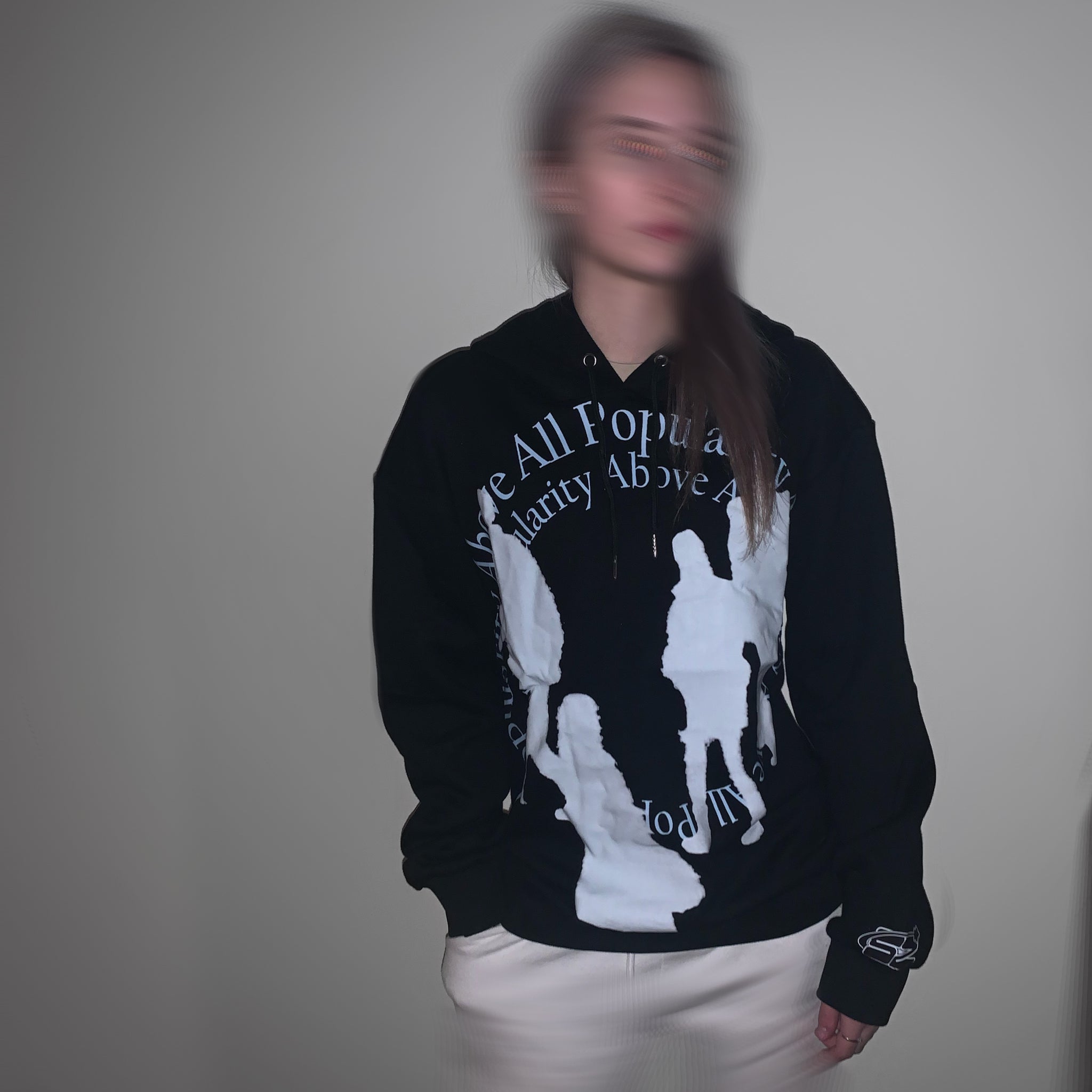 • The Above all hoodie black features a 100% cotton construction with a plush fleece interior for maximum comfort. The hoodie is true to size and unisex, plus its 350 gsm weight ensures lasting warmth and durability. And with no pockets or zippers, it offers a sleek, clean look perfect for any occasion. Model in photo is wearing a size S and is 160 cm high. Follow washing instructions to extend its life.